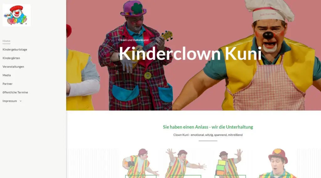 Clown Kuni ist ein Alleinunterhalter für Kinderfeste jeder Art und wird bevorzugt für Kindergeburtstage, für Kindergärten oder als Kinderunterhaltung auf Hochzeiten gebucht. Neben klassischen Clownerie-Shows ist Clown Kuni auch ein Ballonkünstler und fasziniert große und kleine Zuschauer mit verblüffenden Tierfiguren aus Luftballons.