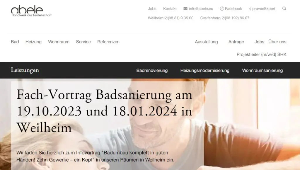 Die Abele Haustechnik GmbH ist ein mittelständisches Unternehmen für Badrenovierungen und Heizungsmodernisierungen in Weilheim, Oberbayern. Dieses Unternehmen bietet ein umfassendes Spektrum von der Beratung über die Planung bis hin zur praktischen Umsetzung. Neben diesem großen Service-Angebot, betreibt die Abele Haustechnik auch 2 großflächige Badezimmer-Showrooms, in denen sich die Interessenten einen optischen Eindruck über Ihr zukünftiges Traumbad machen können. Abele ist ein langjähriges Traditionsunternehmen und verfügt über eine große Stammkundschaft und wird gerne von ihren zufriedenen Kunden weiterempfohlen.