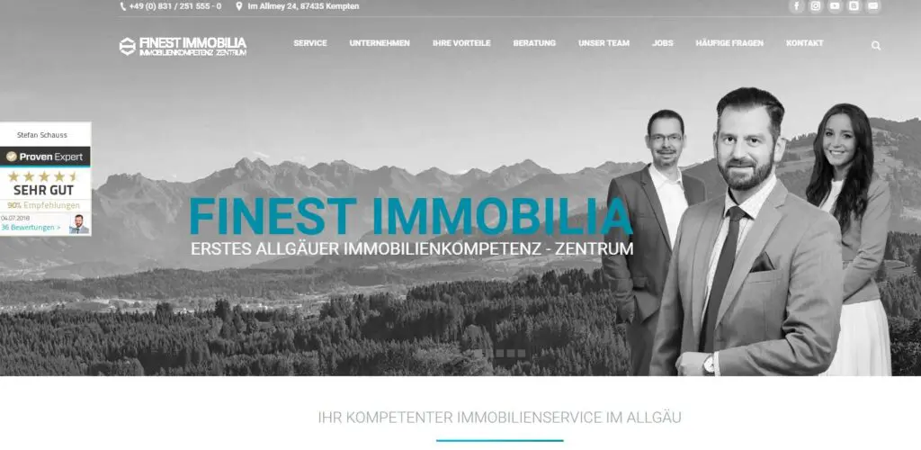 Finest Immobilia ist eine Immobilien-Service-Agentur aus Kempten. Ich arbeite nun schon seit 2016 mit dem Geschäftsführer Stefan Schauß an verschiedenen Onlineprojekten in der Immobilien-Branche. Als Immobilien Kompetenzzentrum bietet Finest Immobilia nicht nur klassische Immobilienmakler Dienstleistungen an, sondern auch: Bewertung, Beratung und Vermittlung für den Verkauf Häusern, Grundstücken und Wohnungen. Neben einer regelmäßigen Zeitungskolumne im Immobilienteil einer Wochenzeitung betreibt Herr Schauß auch Ratgeber-Portale und Webinare für den Verkauf von Immobilien.