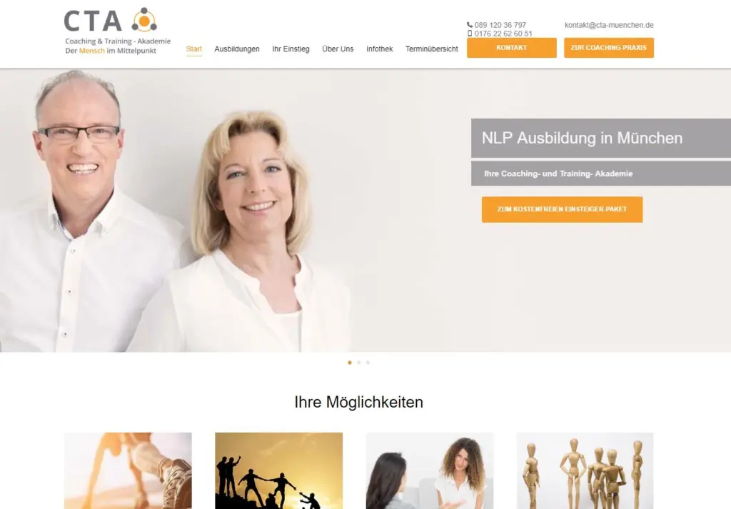 Die CTA Coaching und Training Akademie ist eine private Ausbildungs- und Fortbildungs-Einrichtung für NLP-Ausbildungen, Hypnose-Coachings und klassische Business-Coachings. Die Akademie hat zwei Standorte, einmal in München und seit 2019 auch in Augsburg und bietet dort die verschiedensten Ausbildungen und Fortbildungen rund um das Thema NLP und Coachings an. Die Abkürzung NLP steht für das sogenannte Neurolinguistisches Programmieren und soll den Absolventen dabei unterstützen, sich beruflich und privat besser zu entfalten, um das eigene Potenzial größtmöglich auszuschöpfen.